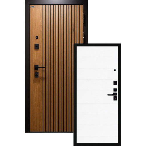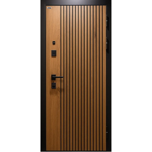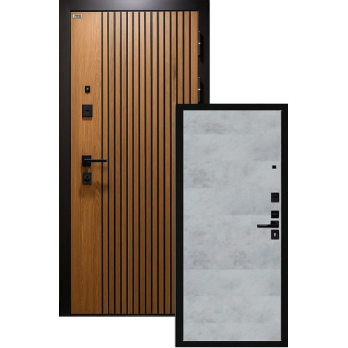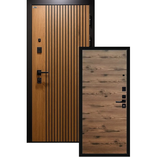 | Внешняя отделка | Металл с полимерно-порошковым покрытием "Чёрный муар", толщиной 1,4мм, Утопленное полотно с МДФ панелью-Деонис в наружном цвете Орех лучистый натуральный с черной патиной. |