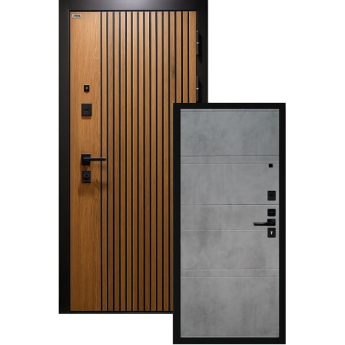 | Внешняя отделка | Металл с полимерно-порошковым покрытием "Чёрный муар", толщиной 1,4мм, Утопленное полотно с МДФ панелью-Деонис в наружном цвете Орех лучистый натуральный с черной патиной. |