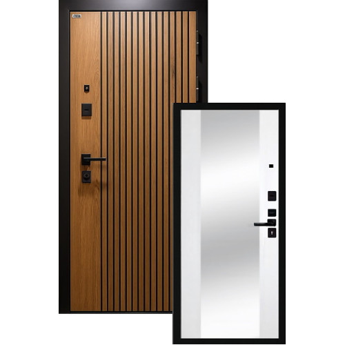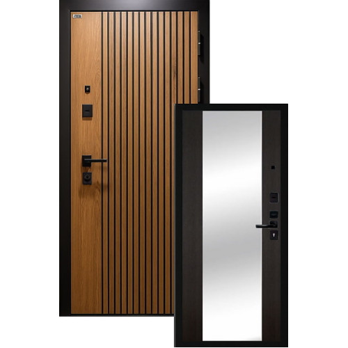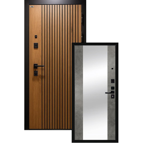 | Внешняя отделка | Металл с полимерно-порошковым покрытием "Чёрный муар", толщиной 1,4мм, Утопленное полотно с МДФ панелью-Деонис в наружном цвете Орех лучистый натуральный с черной патиной. |